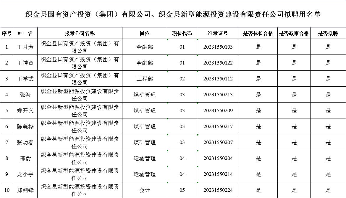 根據(jù)《織金縣國有資產(chǎn)投資(集團(tuán))有限公司、織金縣新型能源投資建設(shè)有限責(zé)任公司2023年面向社會公開招聘工作人員公告》,經(jīng)過報(bào)名、筆試、面試、資格審查、體檢、政審等程序,現(xiàn)對擬聘用人(名單見附件1)予以公示。